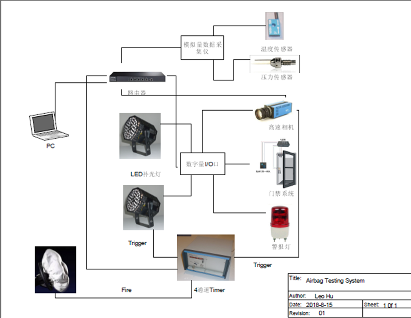 该系统集成了4通道点火Timer,LED灯光系统,高速相机,高低温箱, 门禁,警报器等,如果有环境试验箱,该系统可以同时监控箱内温湿度,集成箱内外排风的开启关闭控制,以及环境箱门的开启和关闭。集成控制部分嘉倍只提供控制信号,相应的被控制设备由客户自己提供。