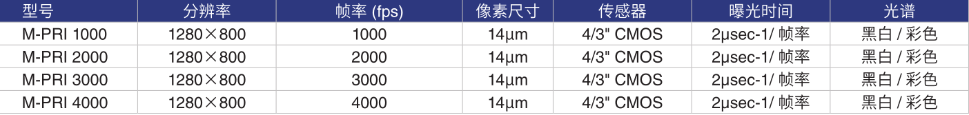 M-PRI 具有 4 种不同帧率等级的型号供用户选择,zui大帧率分别为 1000fps/2000fps/3000fps/4000fps@1280×800。
