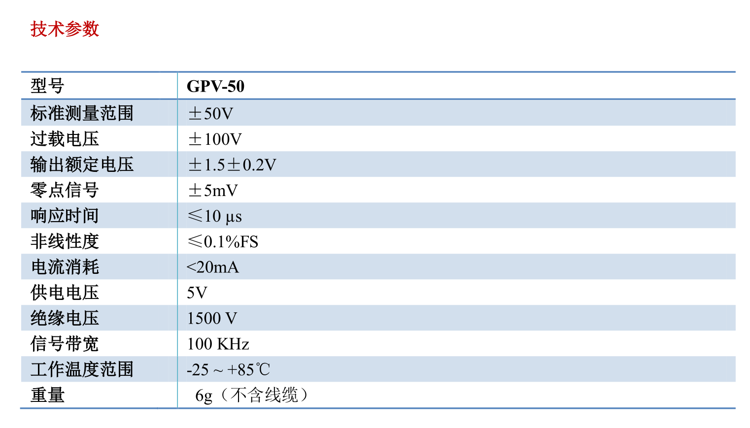 电压传感器 GPV-50,用于实现对车辆上电瓶电压的测量,低压电器设备碰撞试验过程中实时状态检测等。传感器采用低温漂除法电路,实现信号的输出与电压的输入线性关系,同时满足数据采集设备的信号要求。默认量程±50V,其他量程可定制(小于 100V)。该传感器内部对电源和信号全隔离。传感器拥有可靠的短路保护措施,体积小,精度高。