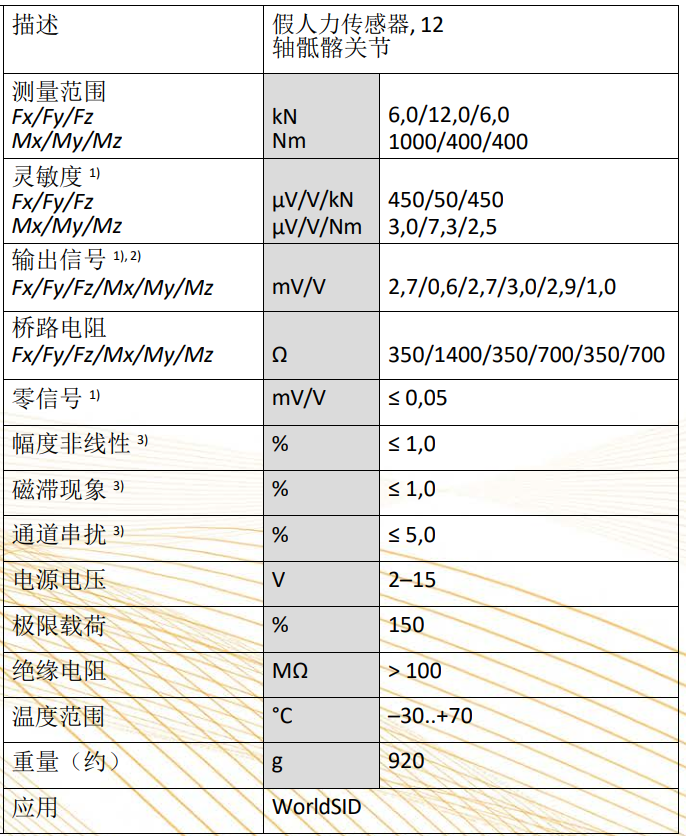 World-SID假人骶髂力传感器,十二轴Fx,Fy,Fz,Mx,My,Mz左右方向测量,等同于FTSS型号W50-71130,量程Fx=6kN,Fy=12kN,Fz=6KN,Mx=1000Nm,My=400Nm,Mz=400Nm ,非线性≤1%。重量920g。