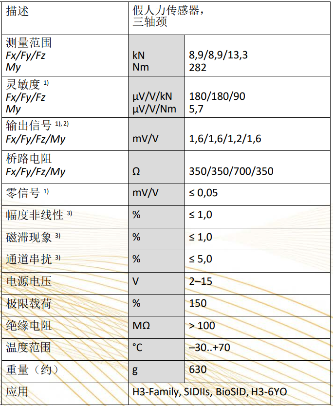 H3-5%,H3-50%,H3-95%,H3-6YO,H3-10YO,SIDIIs假人颈 部力传感器,四轴方向测量Fx,Fy,Mx,My,等同于FTSS型 号IF-256,量程Fx=Fy=8.9KN, Fz=13.3KN,My=282NM,非 线性≤1%,重量630g。