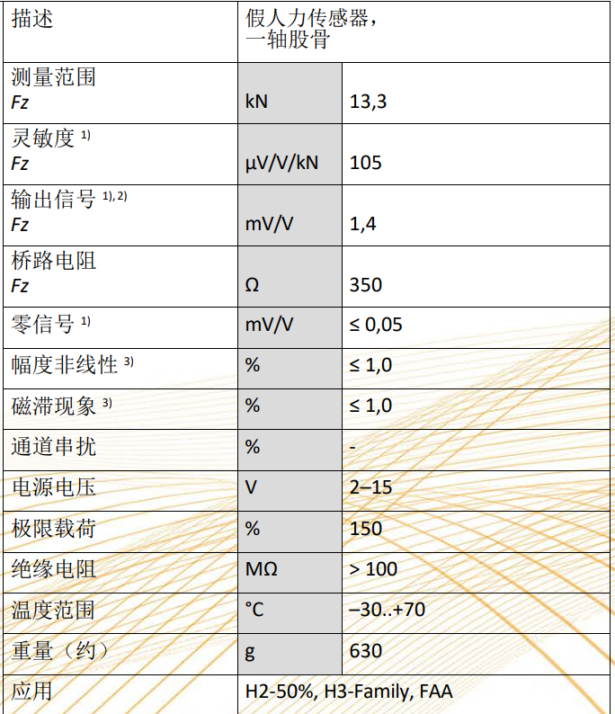 H2-50%,H3-50%,H3-5%,H3-95%,FAA假人大腿力传感 器,双轴Fz方向测量,等同于Denton型号3821,量程FzR=FzL=13.6KN,非线性≤1%。