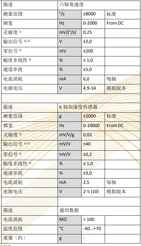 六轴惯性单元(三轴角速度和三轴加速度),量程: ±8000°/s,500g;尺寸:仅24*24*24mm³;工作温度:- 40至70℃;带宽:2000Hz,10000Hz;非线性:1%FS;串 扰:±5,±3;横向灵敏度:5%;螺栓安装;线缆可拆 卸;数字量输出可选;适用于碰撞测试/疲劳试验等各类角 速度测量。