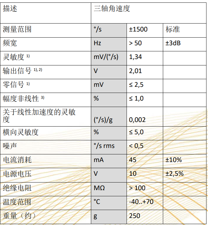三轴,量程:±1500°/s;重量:100g;尺寸:65*44*45mm³;工作温度:-30至70℃;带宽:50Hz/±3dB;非线性:1%FS;横向灵敏度:5%;螺栓安 装;适用于碰撞测试/疲劳试验等各类角速度测量。
