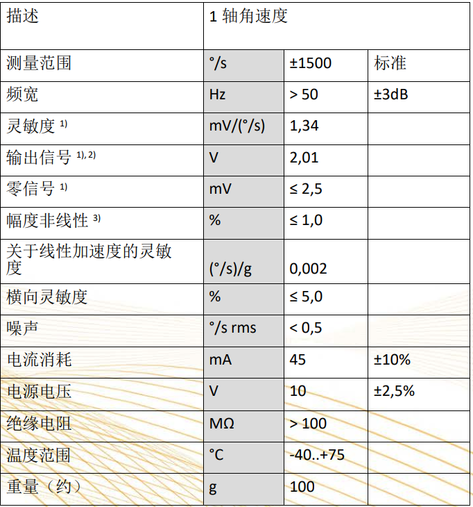 单轴,量程:±1500°/s;重量:100g;尺寸:65*44*45mm³;工作温度:-30至70℃;带宽: 50Hz/±3dB;非线性:1%FS;横向灵敏度:5%;螺栓安 装;适用于碰撞测试/疲劳试验等各类角速度测量。