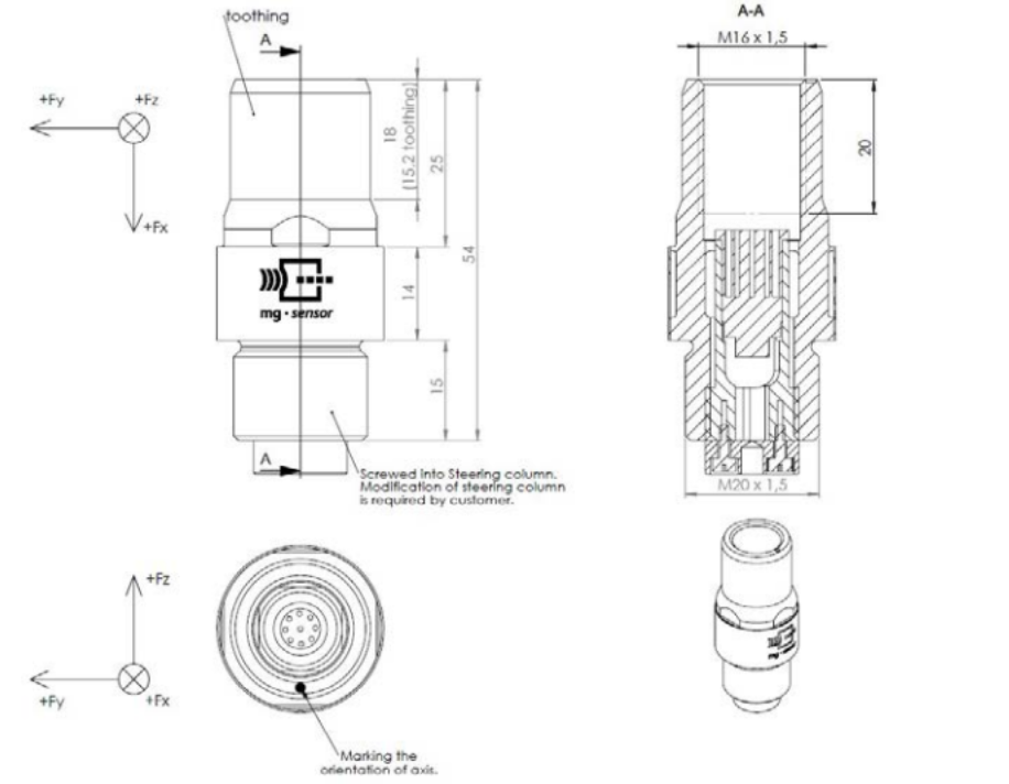 用于碰撞测试中方向盘转向管柱力的测量,三轴Fx,My,Mz方向测量,可以根据客户的要求定制。量程Fx=20KN,My=Mz=150Nm。非线性≤1%。重量120g。