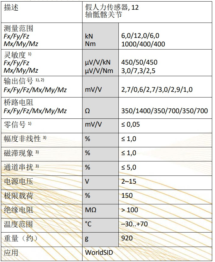 World-SID假人骶髂力传感器,十二轴Fx,Fy,Fz,Mx,My,Mz左右方向测量,等同于FTSS型号W50-71130,量程Fx=6kN,Fy=12kN,Fz=6KN,Mx=1000Nm,My=400Nm,Mz=400Nm ,非线性≤1%。重量920g。