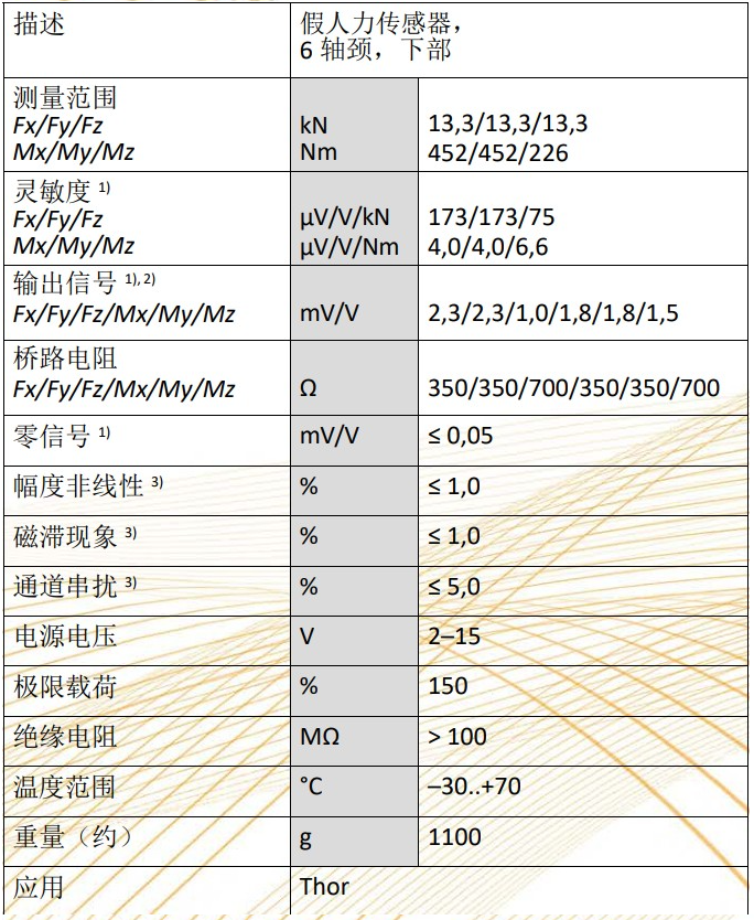 Thor假人下颈部力传感器,六轴Fx,Fy,Fz,Mx,My,Mz方向 测量,等同于Denton型号4366,Humanetics型号10381JI4 , 量程Fx=Fy=Fz=13.3KN,Mx=My=452Nm,Mz=226Nm ,非 线性≤1%,重量1100g。