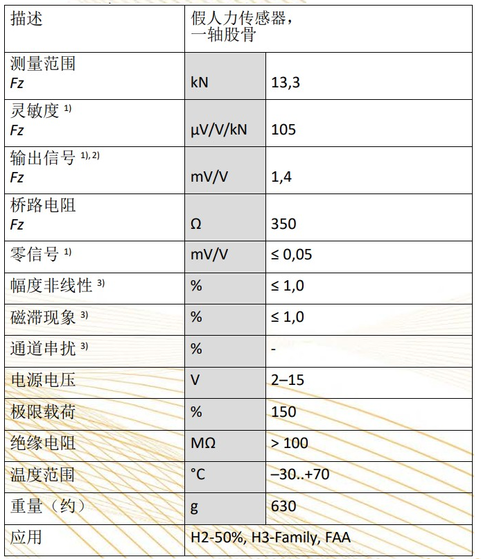 H2-50%,H3-50%,H3-5%,H3-95%,FAA假人大腿力传感 器,双轴Fz方向测量,等同于Denton型号3821,量程FzR=FzL=13.6KN,非线性≤1%。