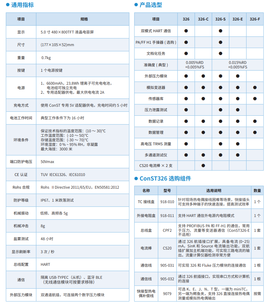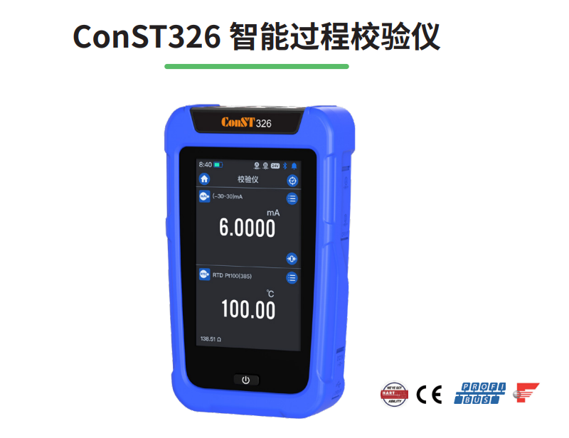 ■.体积更小、重量更轻,单手轻松持握;■.内置 APP,智能手机式操作体验;■.双模式 HART 通信功能;■.可选购总线盒,支持 PROFIBUS.PA 和 FF-H1 通信。●.主要特点ConST326 系列智能过程校验仪内置文档化测试任务,集全功能 HART 手操器、测量表、信号源、回路电源、压力指示仪、数据记录仪、 真有效值万用表、热工计算器等功能于一体。只需一台设备,即可完成现场校准、排障和维护保养等工作,有效提升现场工作效率!