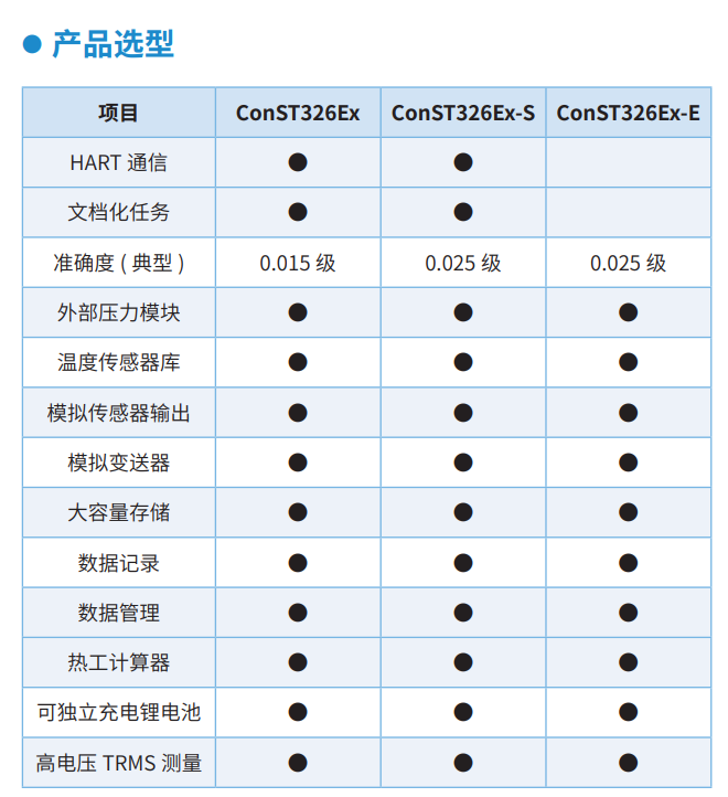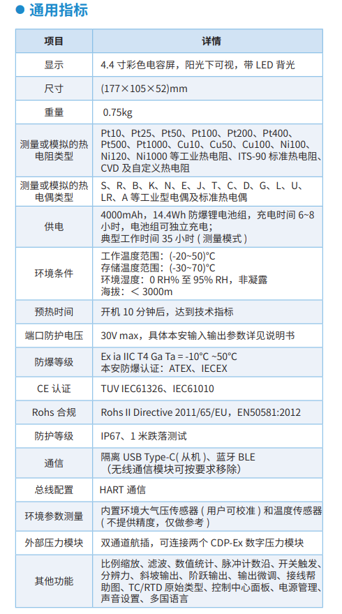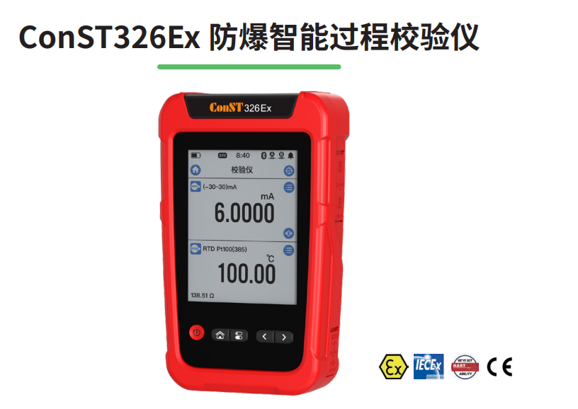 . 0 区防爆;■.体积更小、重量更轻,单手轻松持握;■.内置 APP,智能手机式操作体验;■. HART 通信功能。●.主要特点ConST326Ex 系列防爆智能过程校验仪可用于 0 区防爆环 境,内置文档化测试任务,集 HART 通信、测量表、信号源、回 路电源、压力指示仪、数据记录仪、真有效值万用表、热工计算 器等功能于一体。只需一台设备,即可完成现场校准、排障和维 护保养等工作,有效提升防爆现场工作效率!