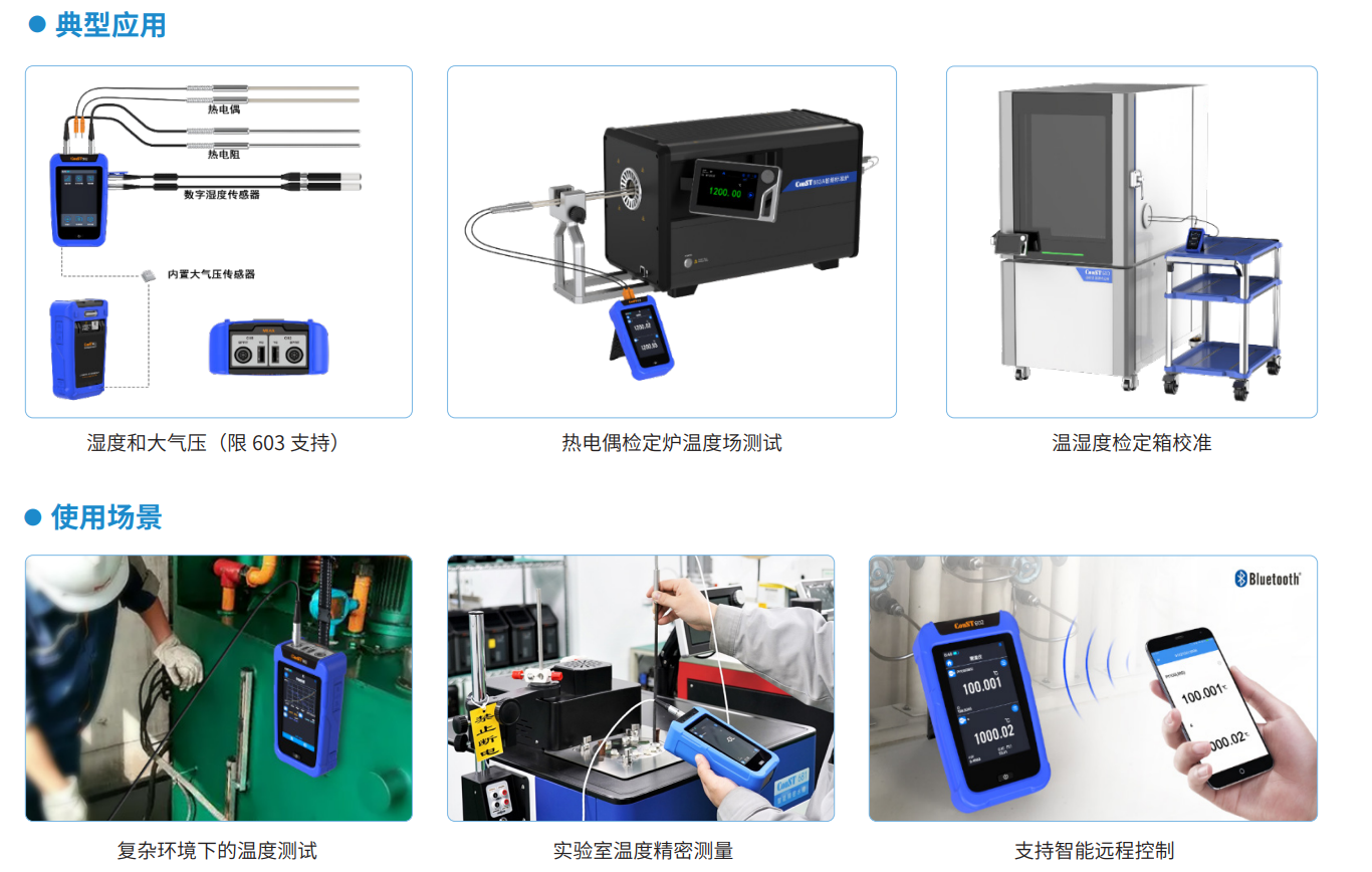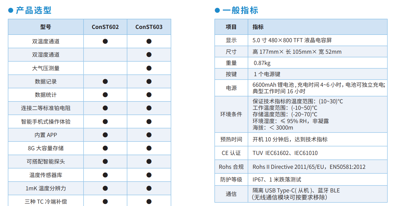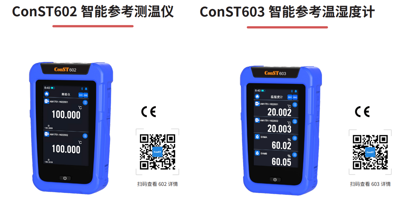 ConST602/603 体积小巧,单手可轻松持握,支持温度的双通道测量与记录,支持曲线显示、无线通信,可用于恒温槽温场测试,也可用于热 电偶炉、干体炉温场测试,还可用于温度的精密测量。产品可广泛用于计量校准、科学实验、工业现场等领域。 ConST603 智能参考温湿度计,还可连接 2 路湿度探头,支持温度和湿度的双通道测量与记录,是精密温湿度测量的好工具。