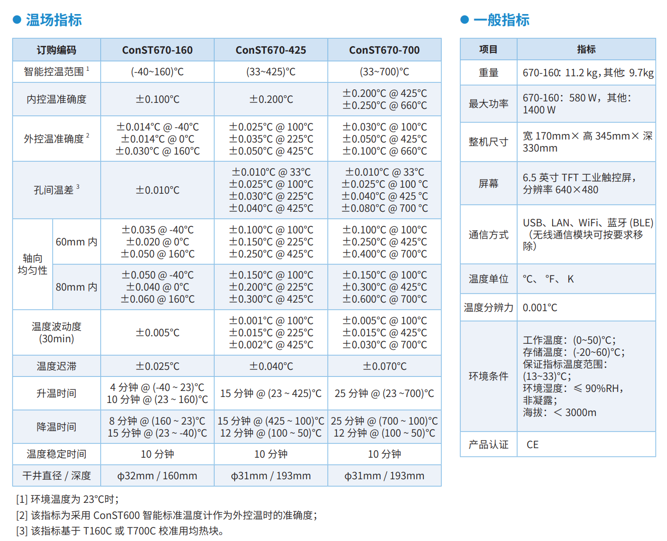 环境温度为 23℃时; [2] 该指标为采用 ConST600 智能标准温度计作为外控温时的准确度;. [3] 该指标基于 T160C 或 T700C 校准用均热块。