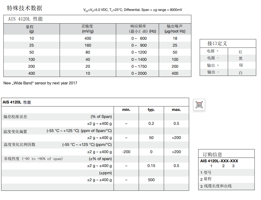 AIS 4120L是一个单轴,低质的电容式加速度 传感器。该传感器具有宽量程温度补偿。电容 技术使小量程成为可能。信号独立于9vdc到24Vdc之间的电源,可选30Vdc。该传感器适用于汽车和工业应用。用于粘合固定。