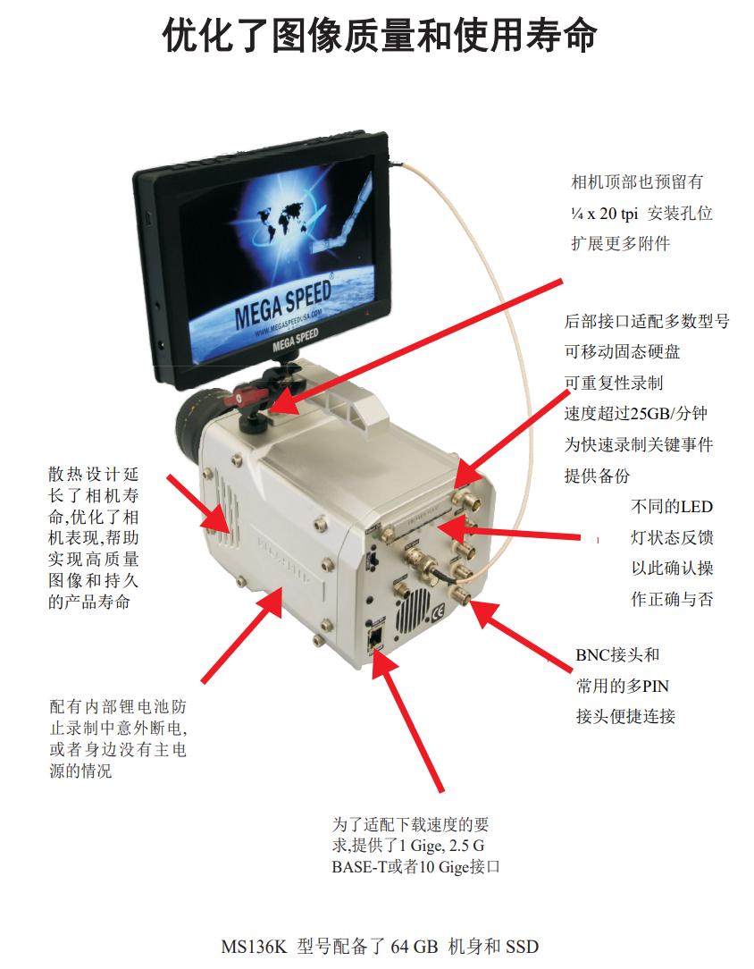 Mega Speed高速相机具有很多出众的性能,如高速可擦写固态移动硬盘,可以通过相机的后媒体舱访问。